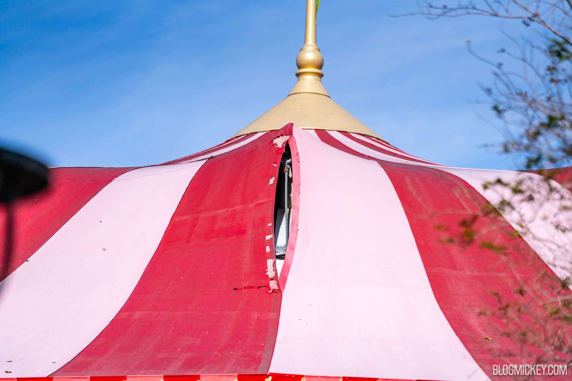 While visiting Magic Kingdom this morning, we stopped by Storybook Circus to check in on the tent structures ahead of a planned refurbishment. As you’ll soon see, the refurbishment couldn’t come at a better time. There are multiple points of damage to the tent, and even a pretty substantial tear in the Pete’s Silly Sideshow tent. Here’s a look around.