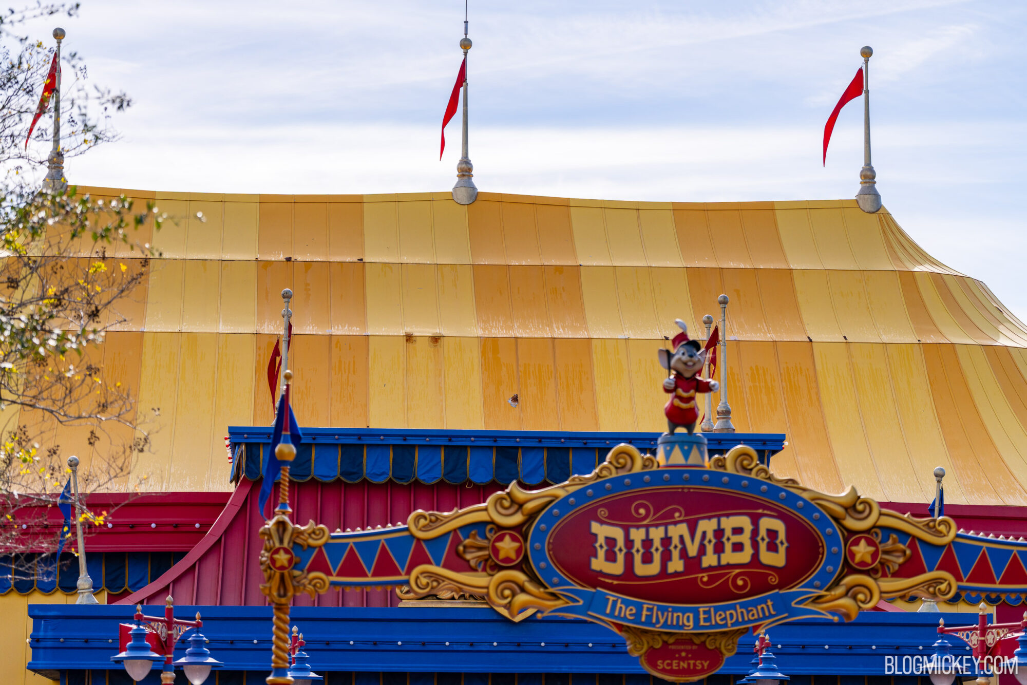 The Dumbo the Flying Elephant structure is also showing signs of wear, but it doesn’t appear to be the same style of tent structure as Pete’s Silly Sideshow and Big Top Souvenirs.