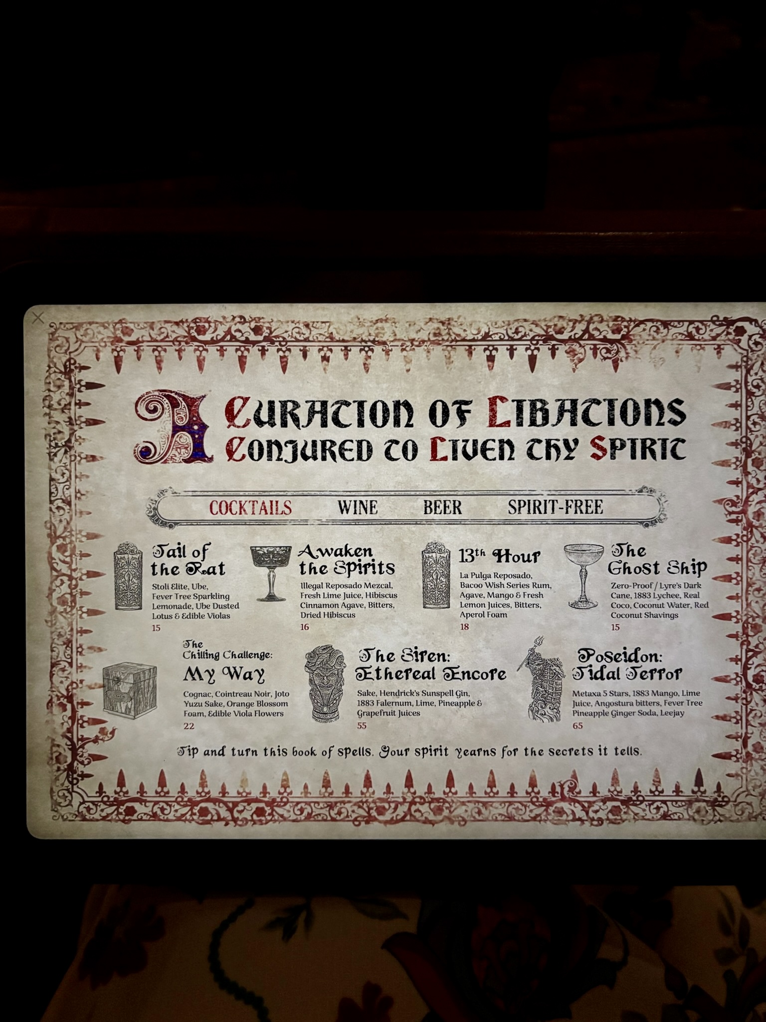 The experience goes well beyond the visuals. The drink menu is filled with cleverly themed cocktails and mocktails, each with its own ghostly twist…some may even reveal hidden effects as you sip. Whether you prefer something chilling, bubbling, or beautifully macabre, the Parlor offers concoctions that are as enchanting as they are flavorful.