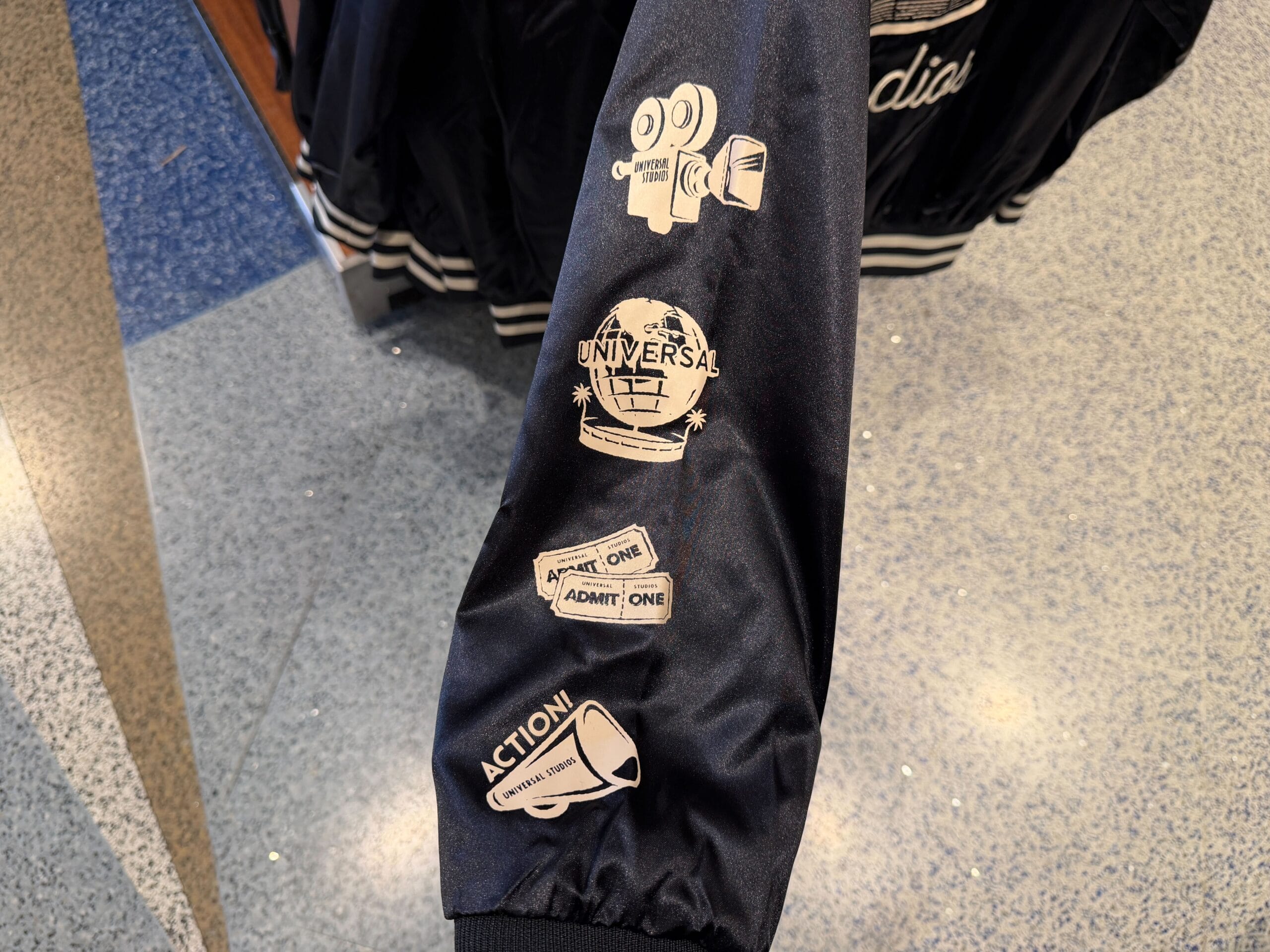 This shiny black jacket has a snap front, two pockets, and ribbed trim. Embroidered in white on the chest is “EST. 1912” (the year the film studio was founded) and “Universal Studios.”