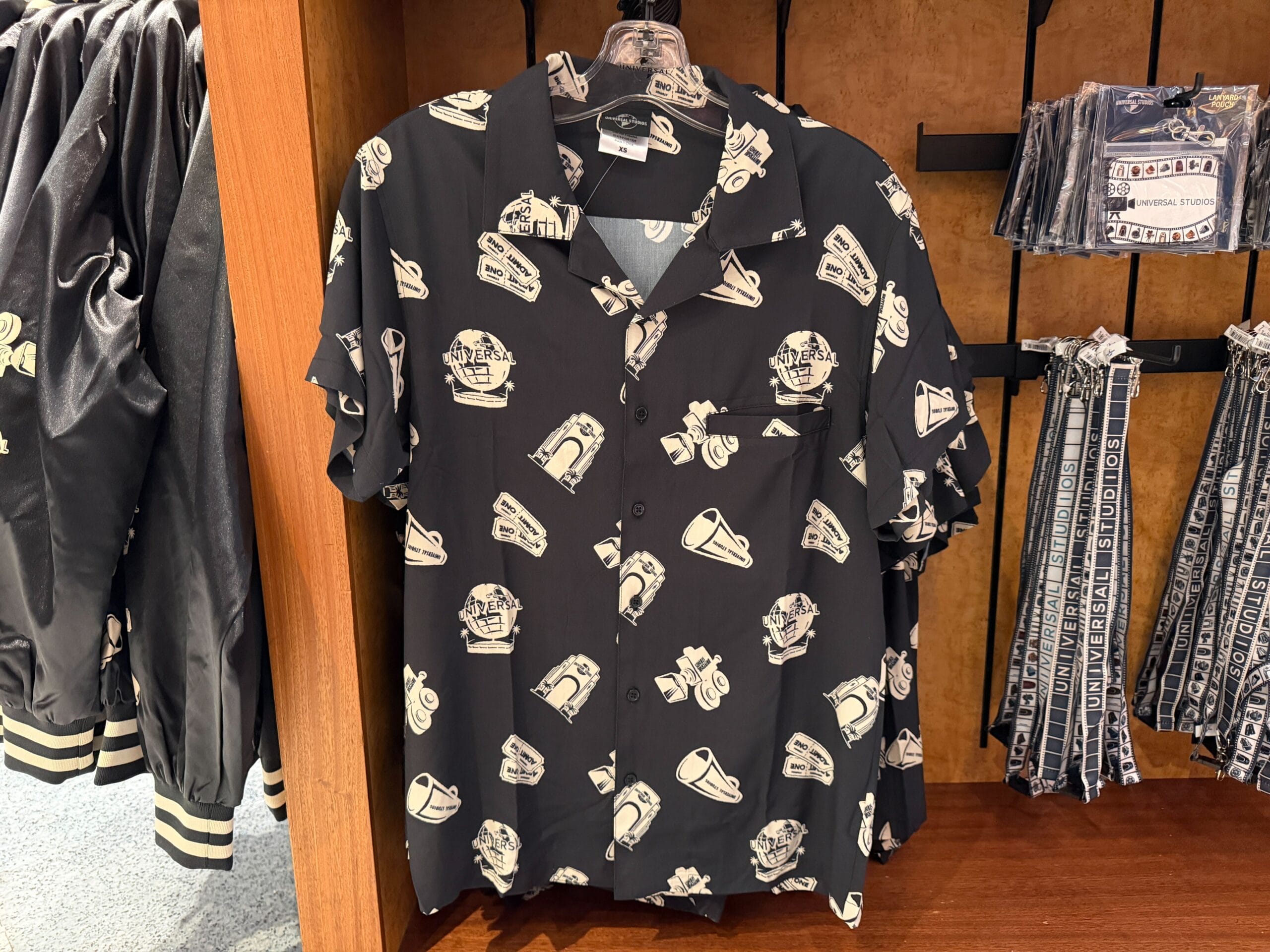 Like the jacket, the button-up is black and white. It has short sleeves and a breast pocket. The all-over print features the Universal Studios archway, globe, film camera, tickets, and megaphone.