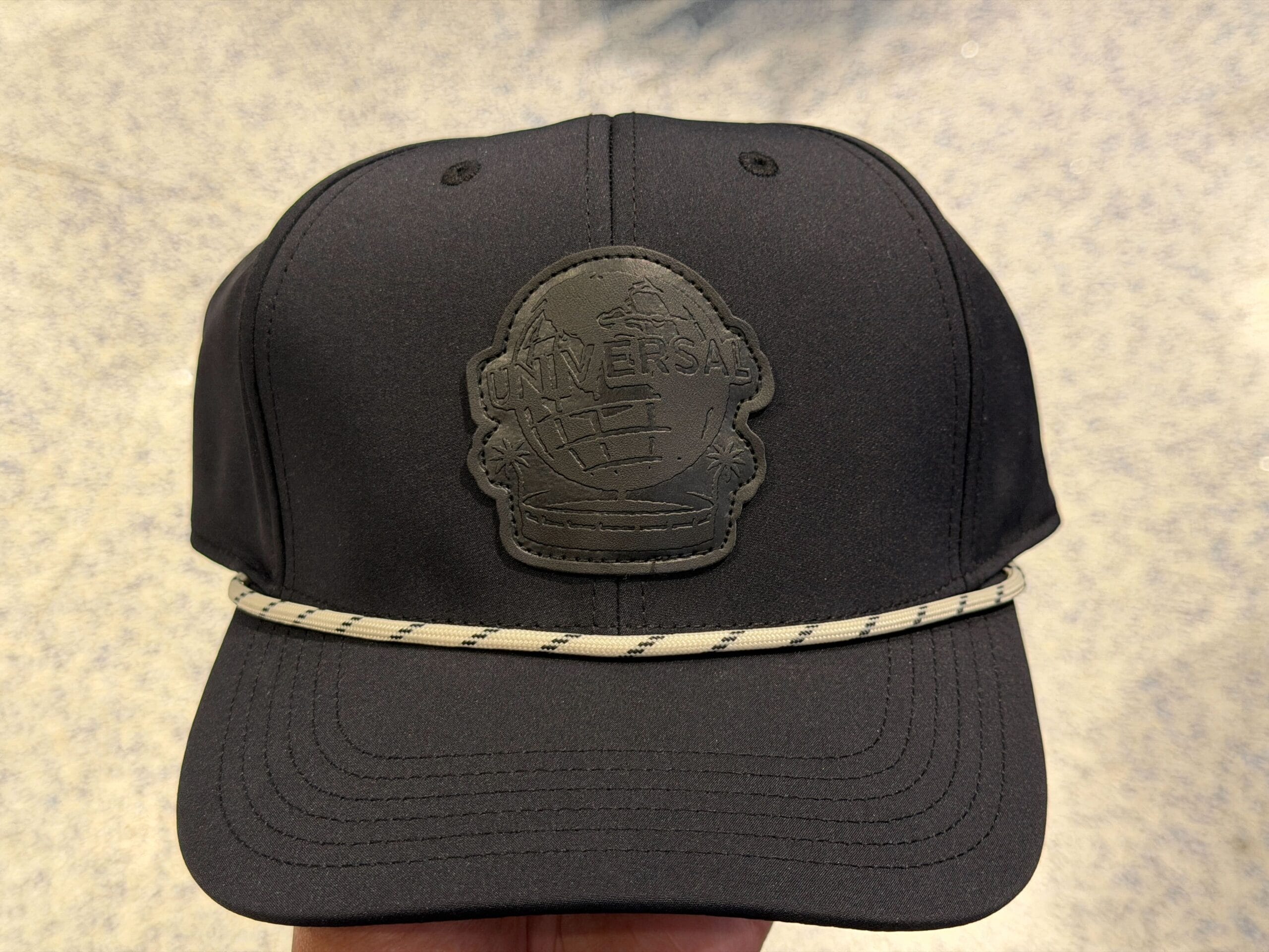 The black ball cap has white cord trim around the front. There are thin black stripes on the cord. A black pleather Universal globe appliqué is on the front of the hat.