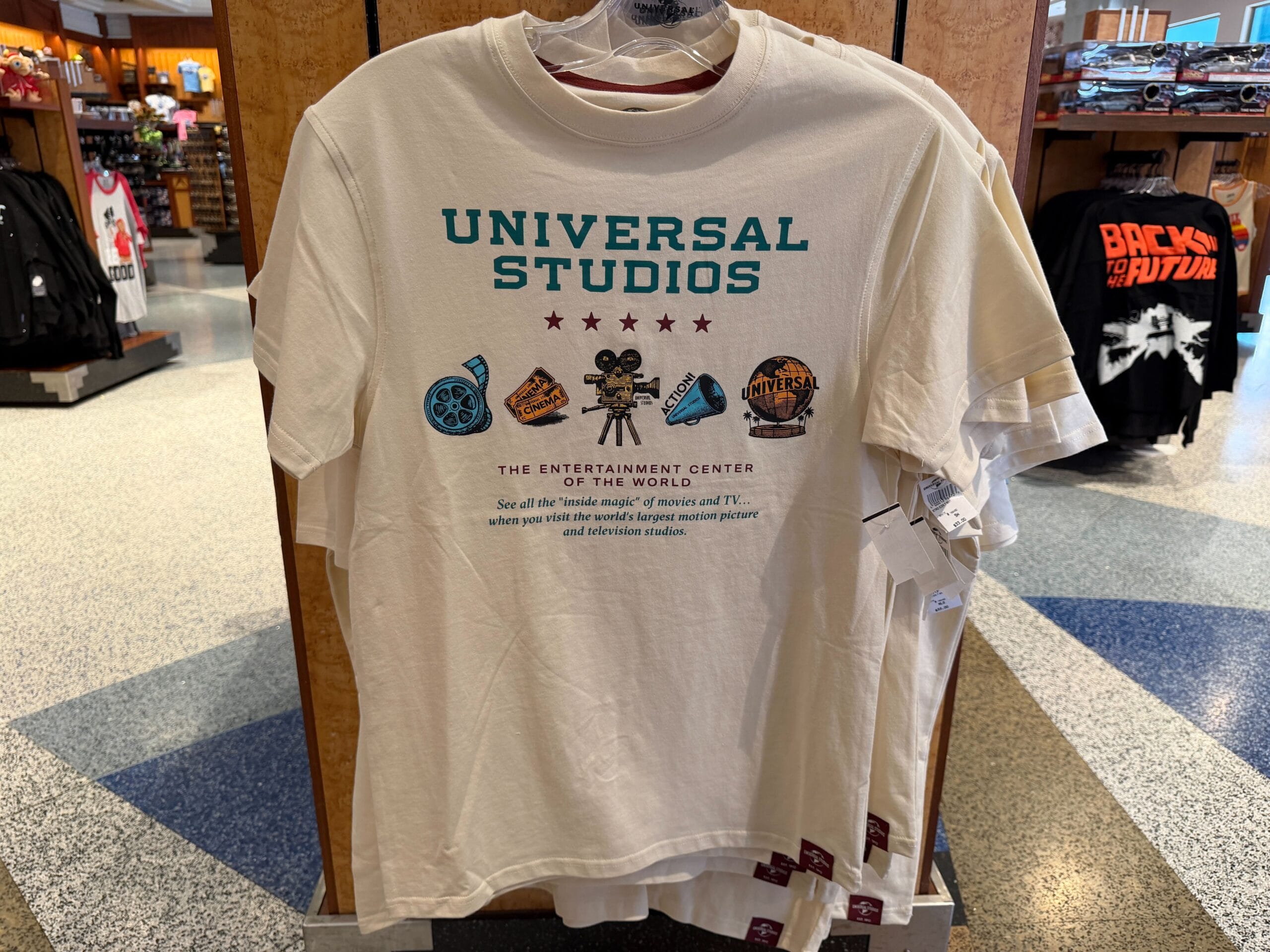 This off-white tee has “Universal Studios” in blue collegiate-style lettering with five red stars. In a row are blue and orange images of a film reel, tickets, camera, megaphone, and globe.