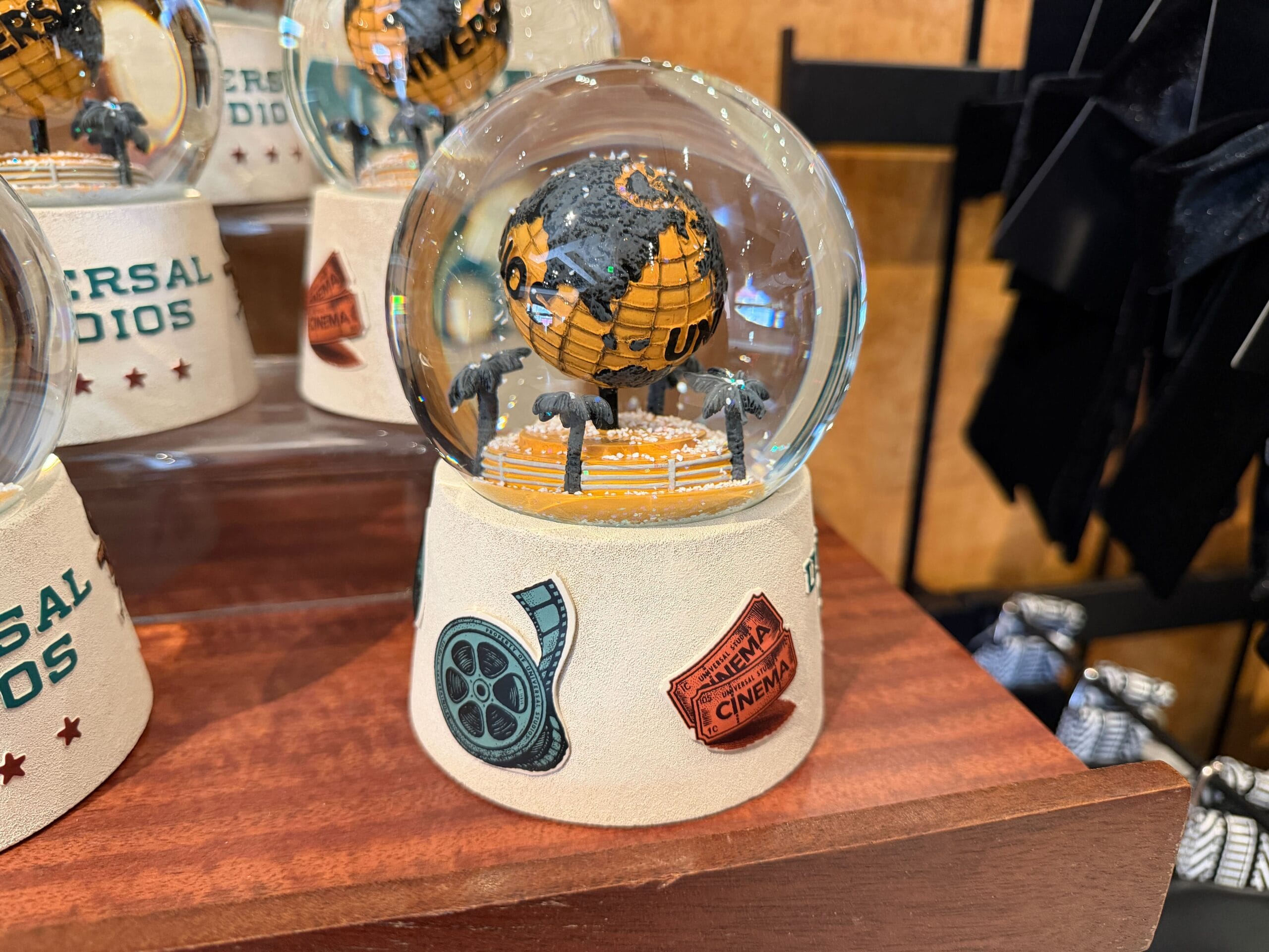 A globe in a globe — a yellow and gray version of the Universal globe sits among gray palm trees inside this snow globe. The white base has “Universal Studios” above a row of stars.