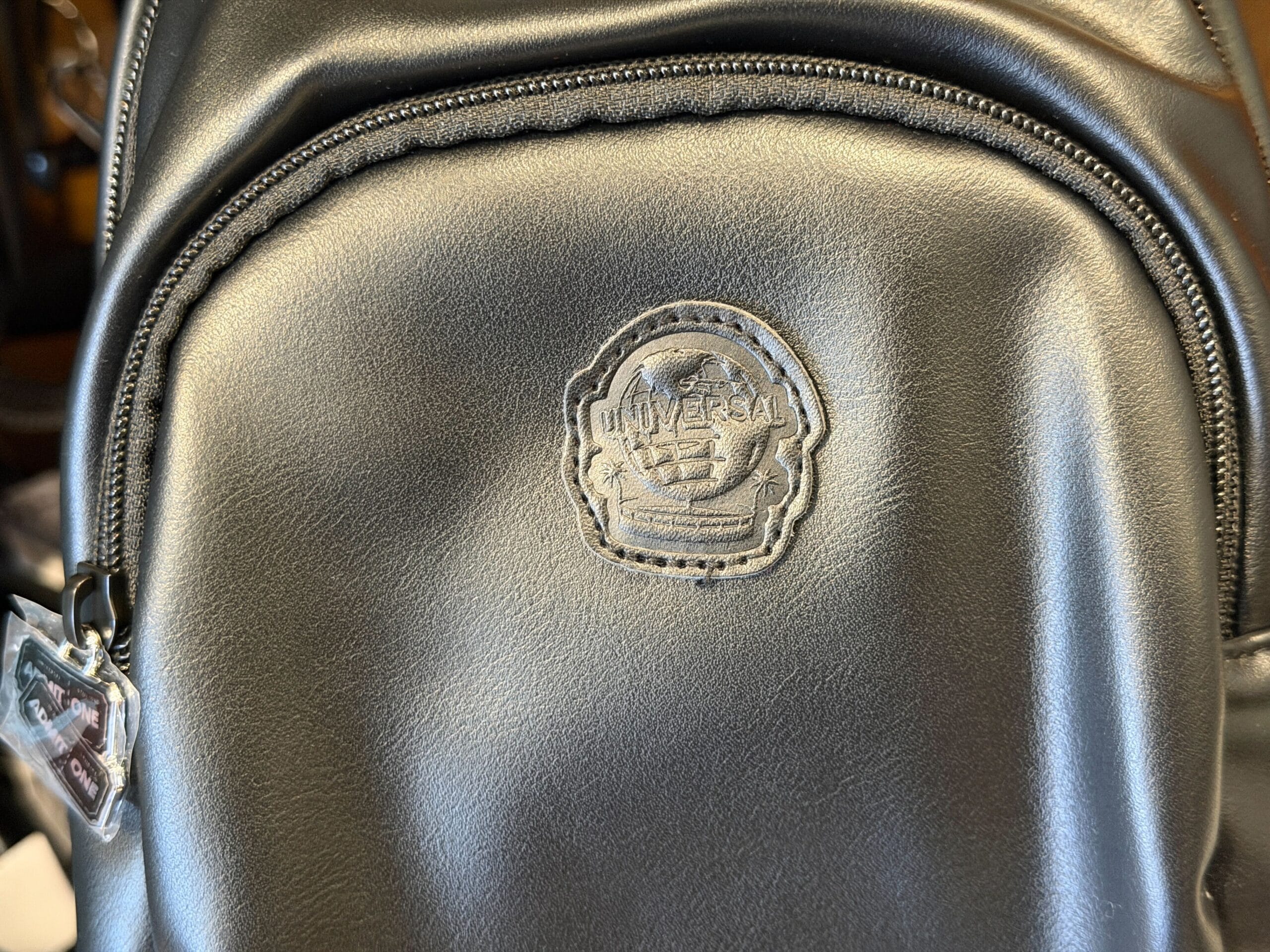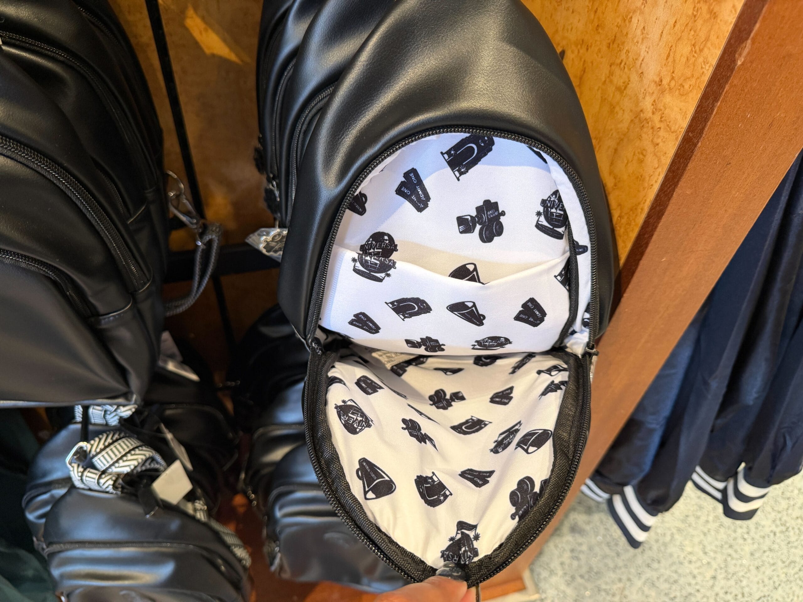 Carry your park essentials in this sling backpack. It’s made of black pleather. It has two zip pockets. On the front is a black Universal globe appliqué.