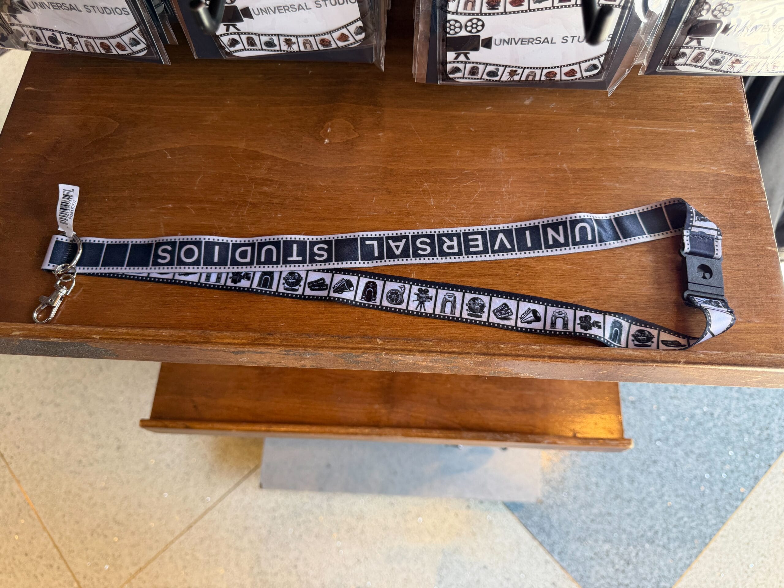 The lanyard resembles a film strip. One side has white squares with colorful icons. The other side has both black and white squares, with black icons inside the white squares. On both sides is “Universal Studios.”