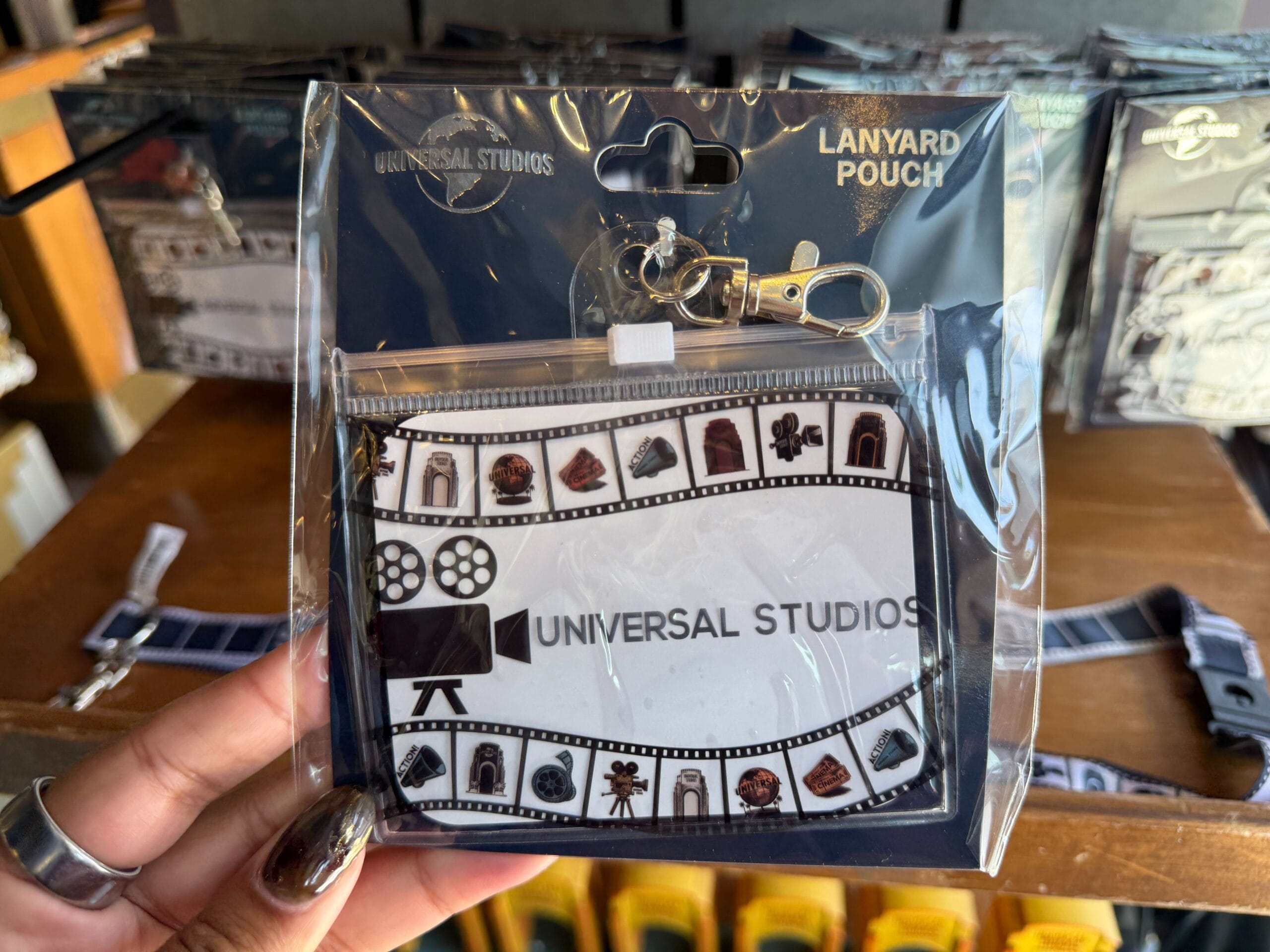 The matching lanyard pouch is white with black film strip borders featuring the film icons. “Universal Studios” is in the center coming out of a projector like a film.