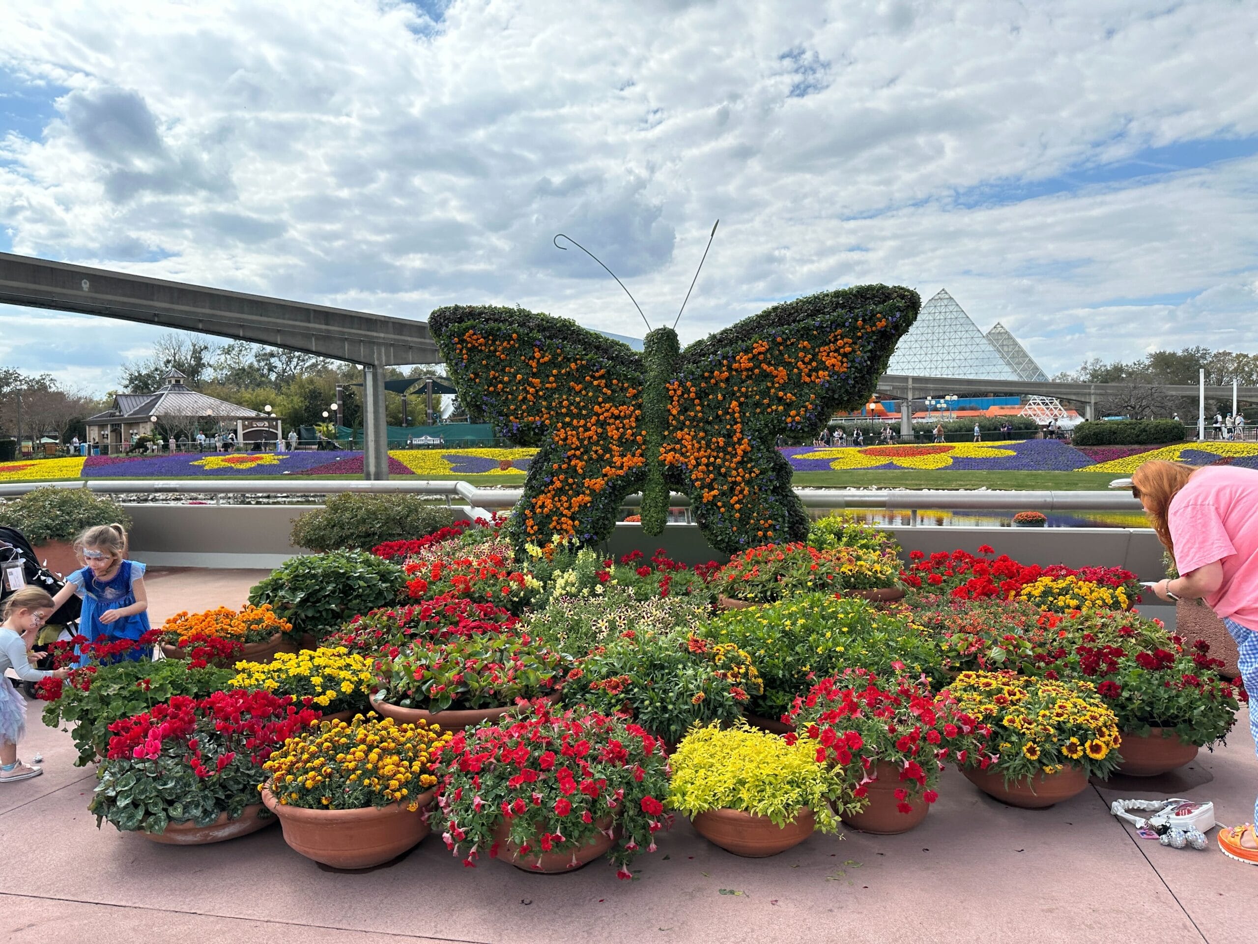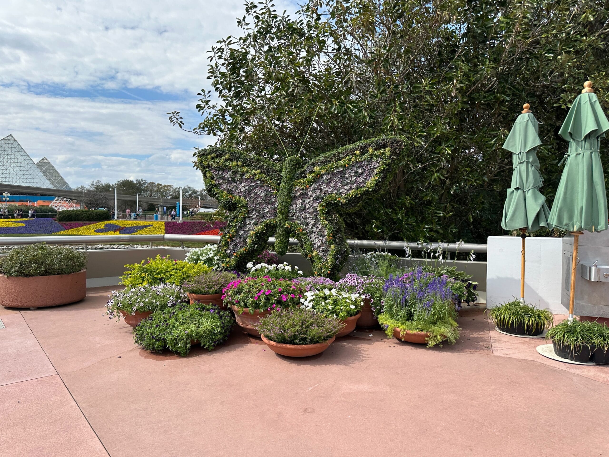 A pair of butterfly topiaries surrounded by pots of flowers has been installed near the Mickey & Friends topiary in World Celebration.